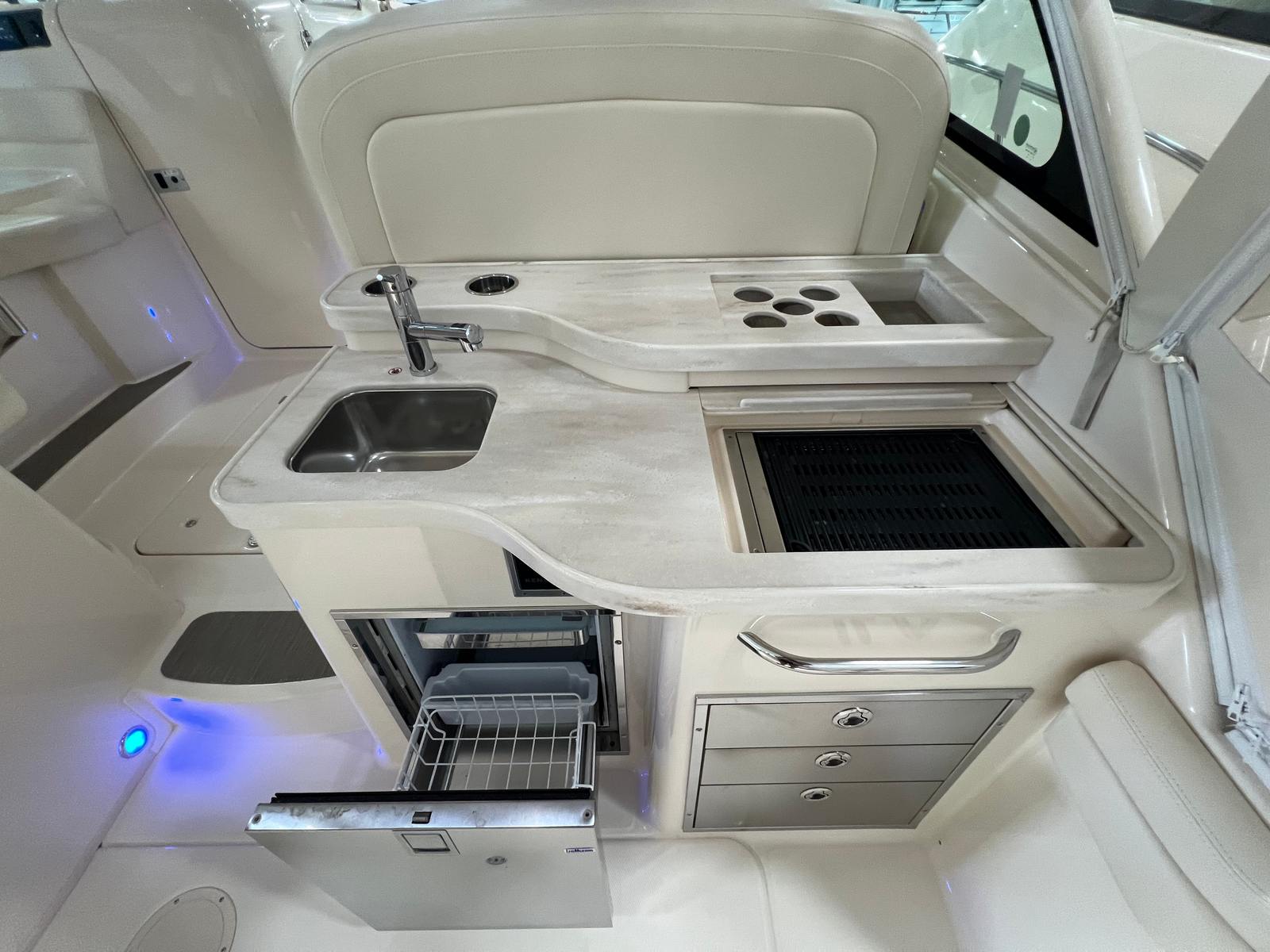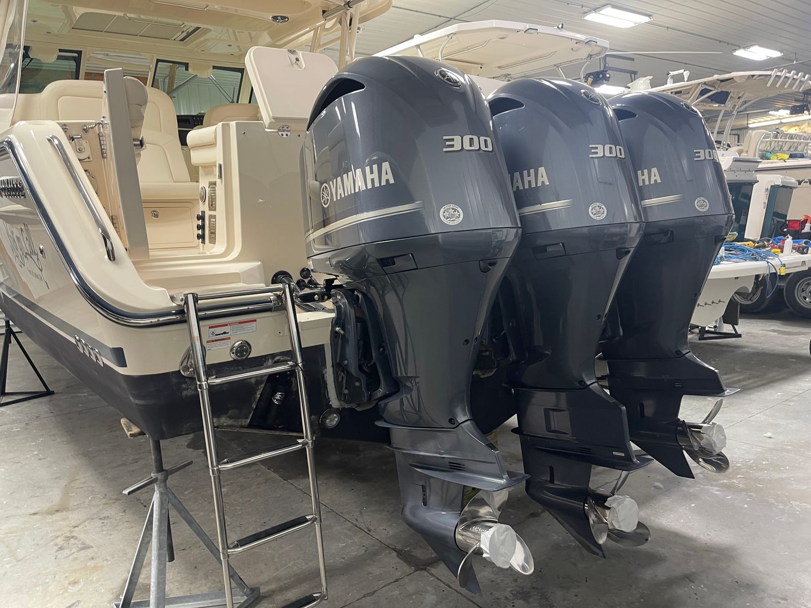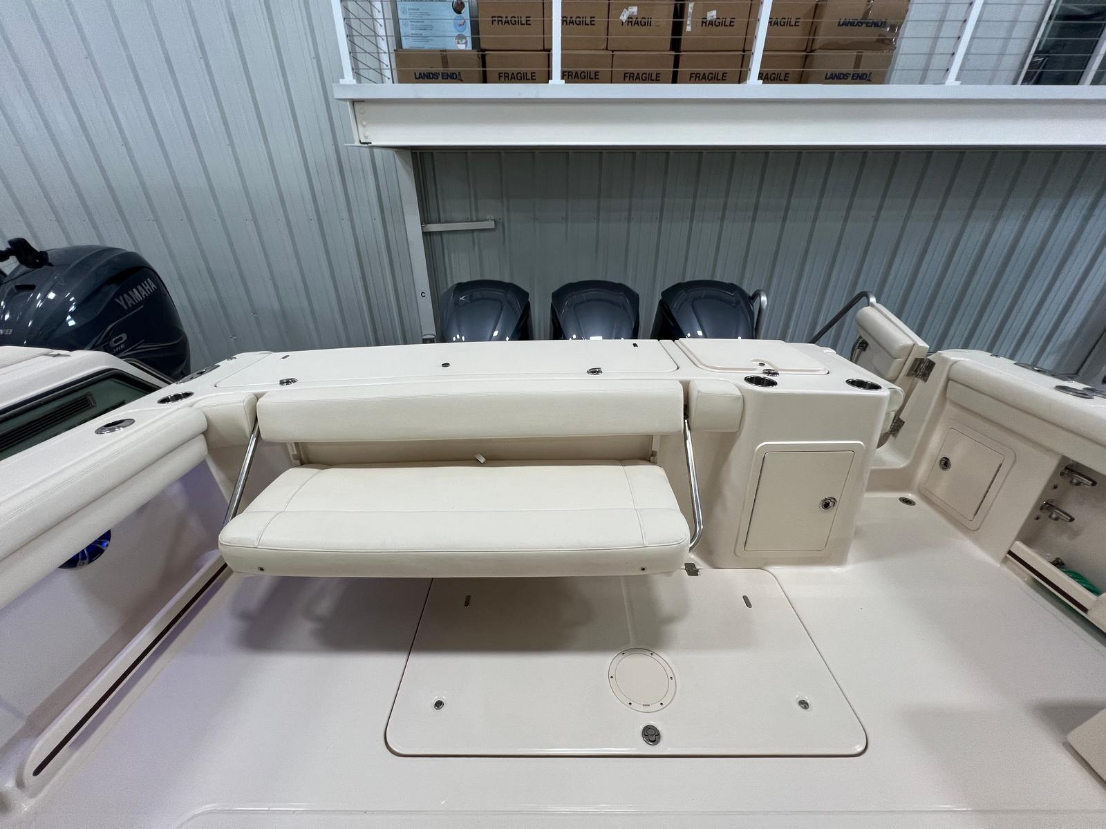 Powering the Freedom 375 are three robust engines, delivering a combined 900 horsepower. With 760 engine hours, these motors have been well utilized, showcasing their reliability and endurance. The triple-engine setup ensures impressive acceleration, smooth handling, and the ability to tackle a wide range of water conditions with confidence. Whether you’re cruising along the coastline or heading offshore for a day of fishing, the Grady-White Freedom 375 provides the power and agility you need for an exhilarating boating experience.