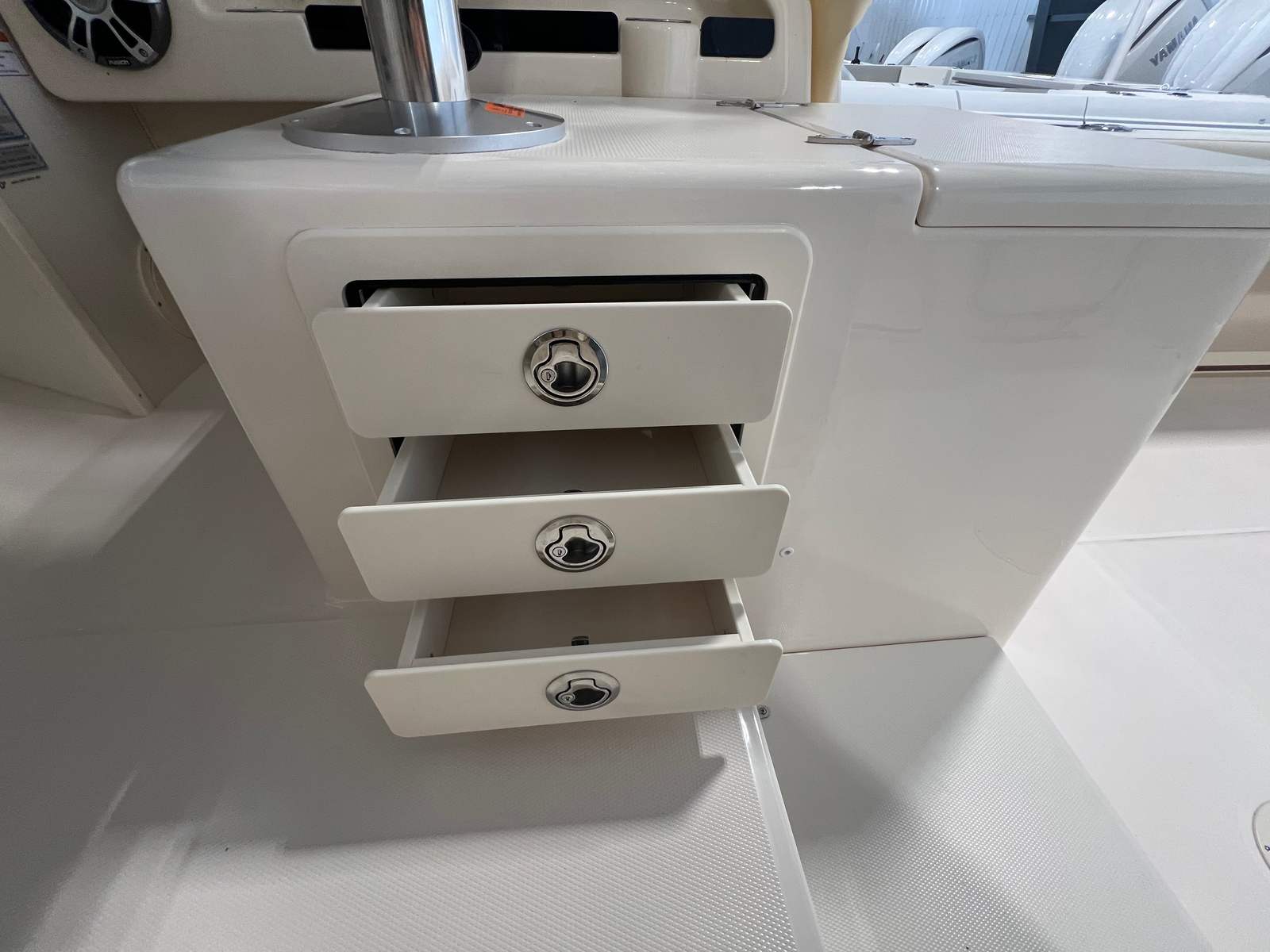 Power and reliability are at the heart of the Grady-White Marlin 300. Equipped with dual Yamaha F300NSB4 engines, this walkaround delivers an impressive combined 600 horsepower, ensuring smooth, responsive handling and exhilarating speed. The Prerig F300NSB4 setup optimizes engine performance, while the advanced hull design provides a stable, dry ride even in challenging offshore conditions. Whether you are cruising to your favorite fishing spot or enjoying a leisurely day on the water, the Marlin 300’s performance inspires confidence and excitement.