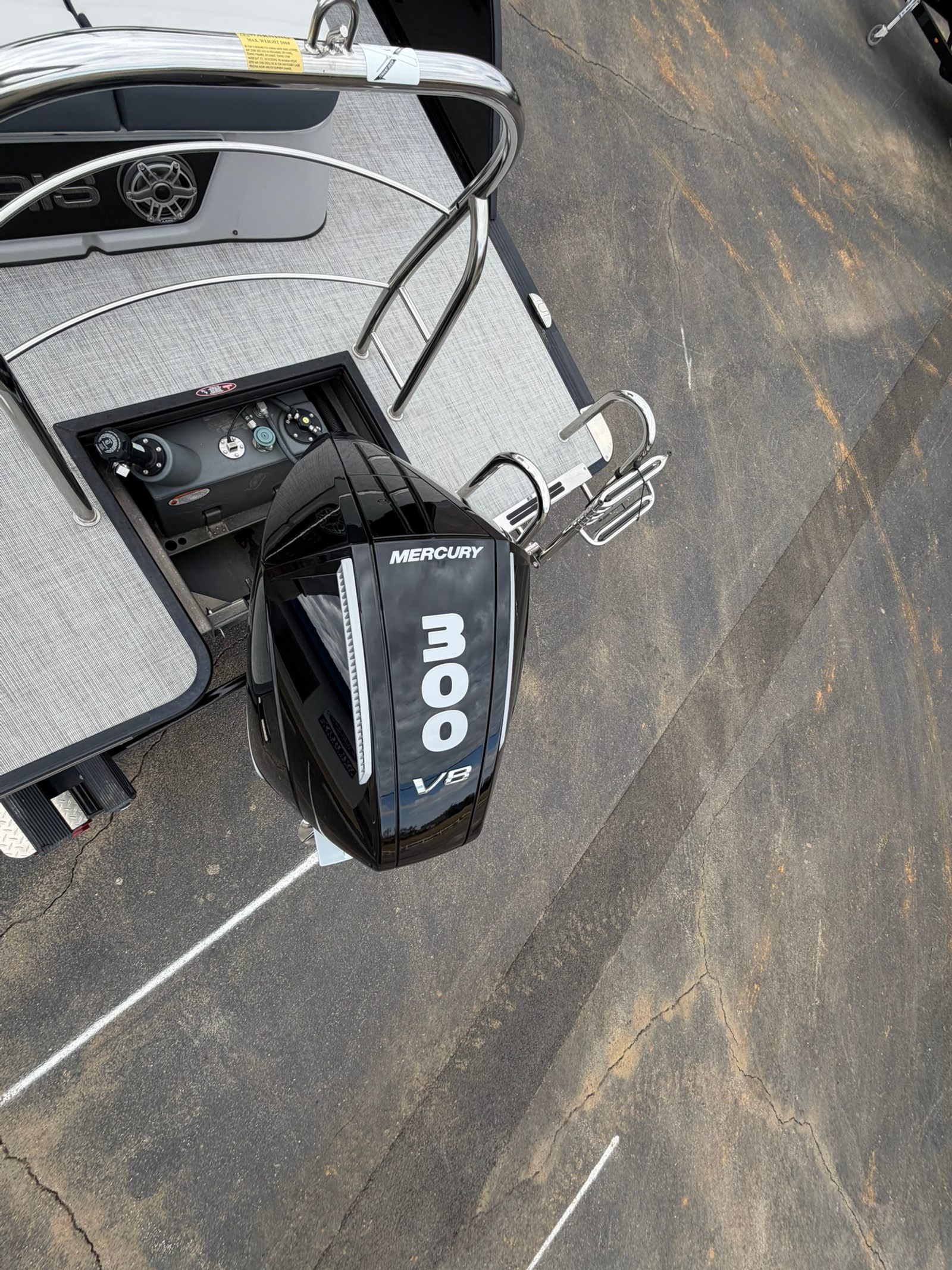Rubrail, ski tow bar, folding ladder, fender clips, and four stainless pop-up cleats.