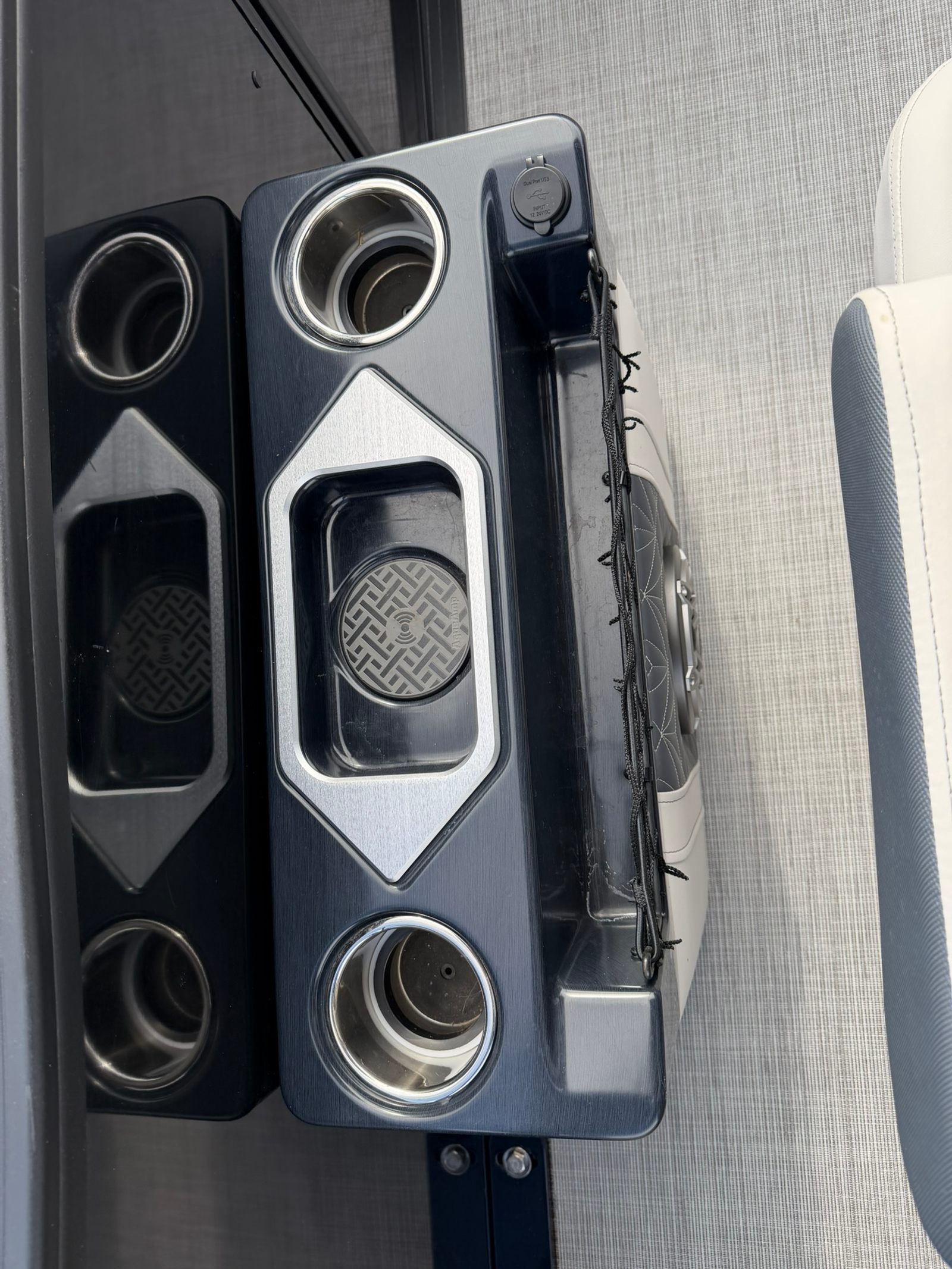 Cockpit, transom, and tower speakers with dual subwoofers and dual transom stereo remotes.
