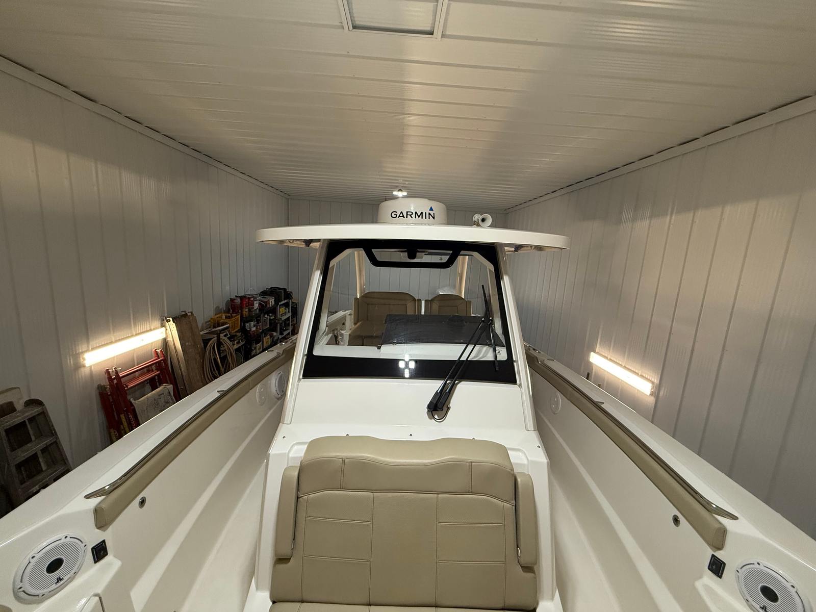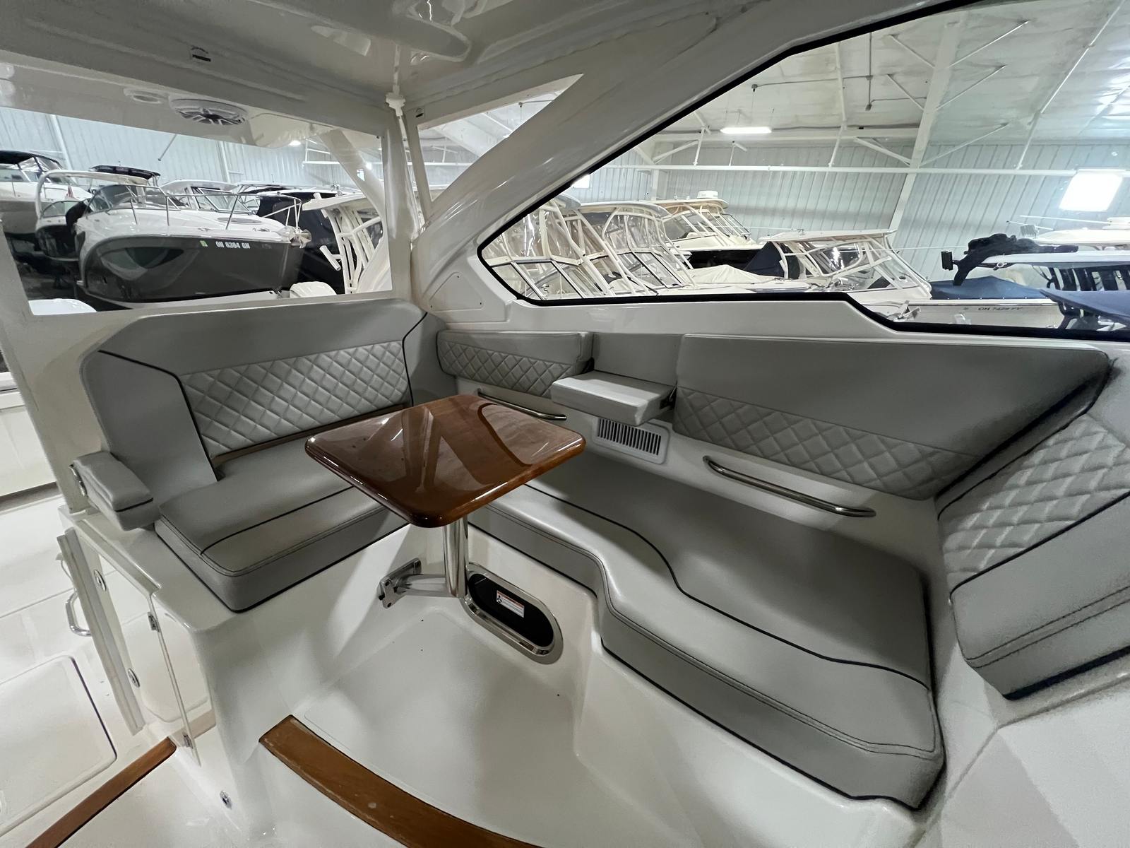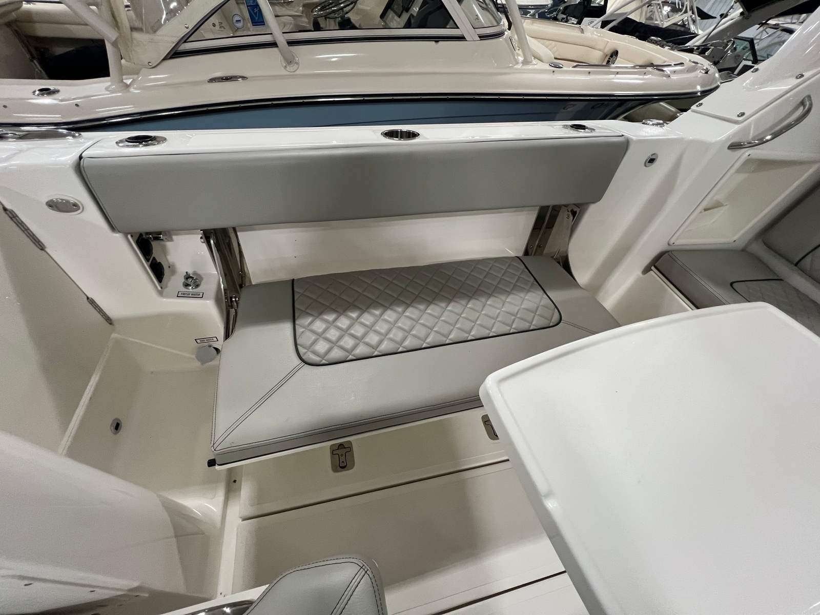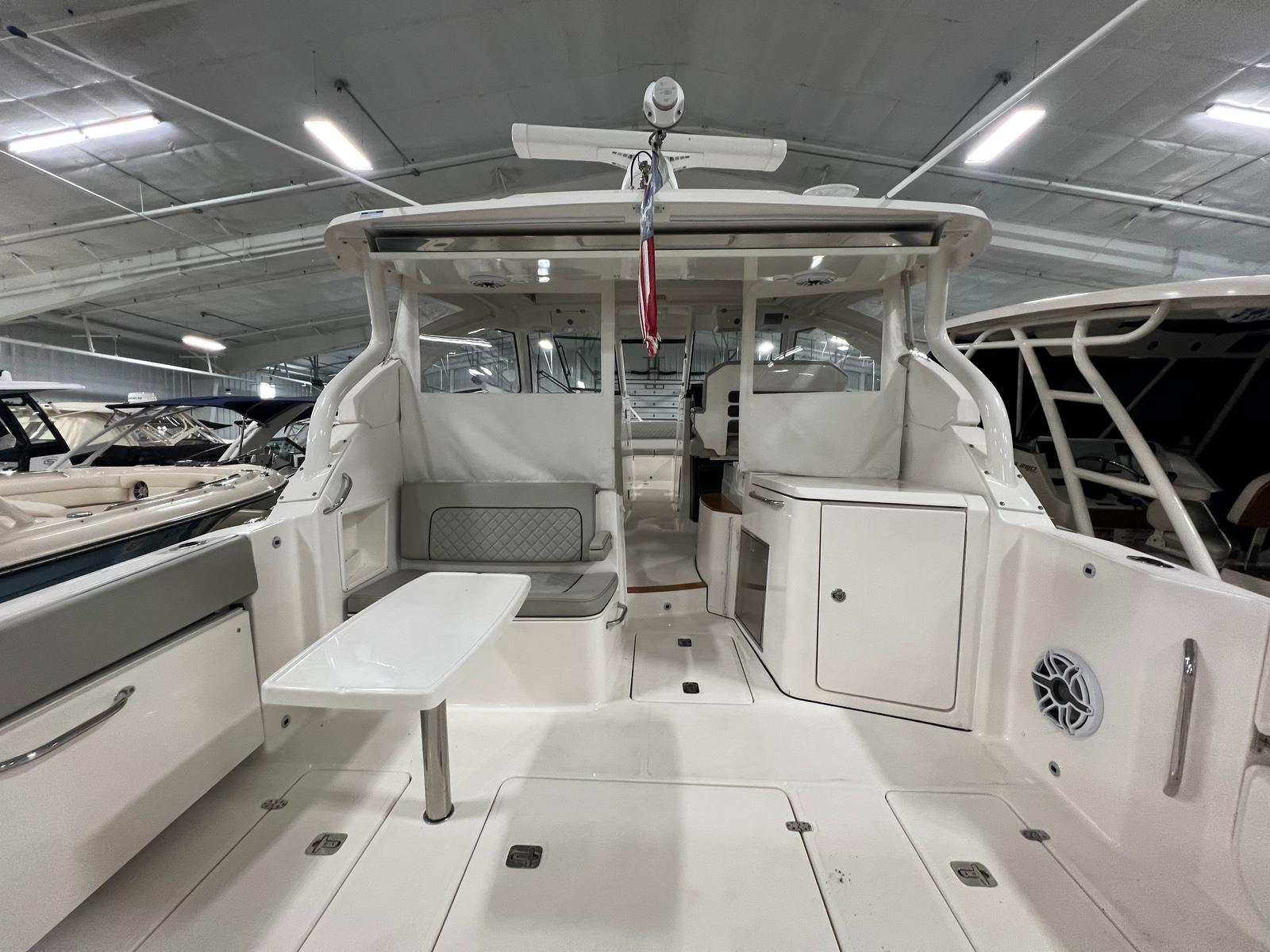 The versatile layout offers an open bow for enjoying sunny days on the water, a powered Mediterranean shade that provides instant relief from the sun, and the ability to fully enclose the helm area when the weather shifts. The boat also features comfortable seating throughout, premium helm electronics, ample storage, a well-appointed cabin, and a head for extended days on the water.