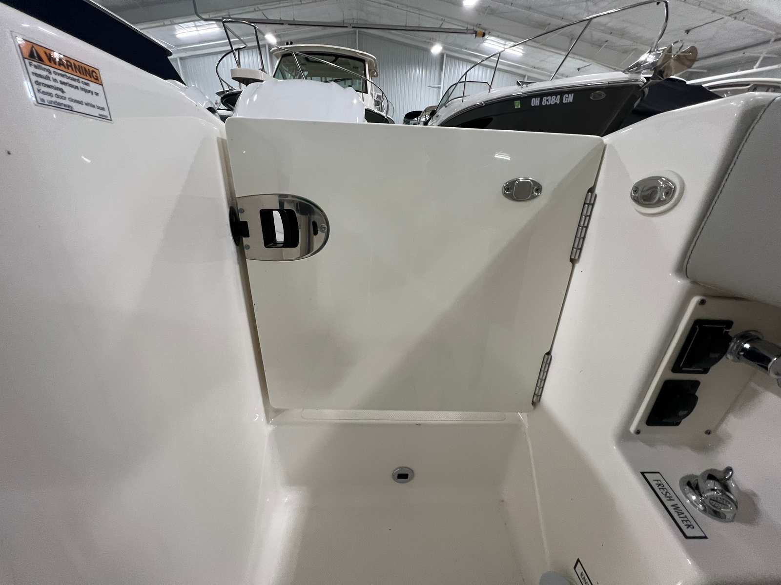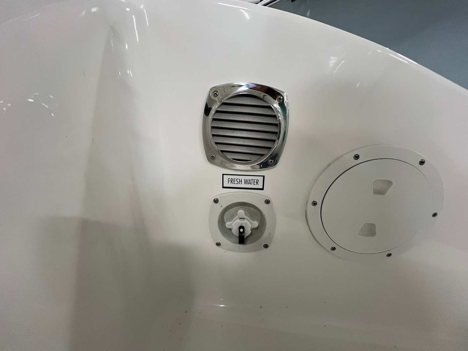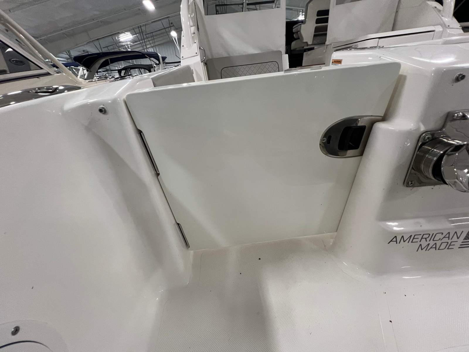 The versatile layout offers an open bow for enjoying sunny days on the water, a powered Mediterranean shade that provides instant relief from the sun, and the ability to fully enclose the helm area when the weather shifts. The boat also features comfortable seating throughout, premium helm electronics, ample storage, a well-appointed cabin, and a head for extended days on the water.