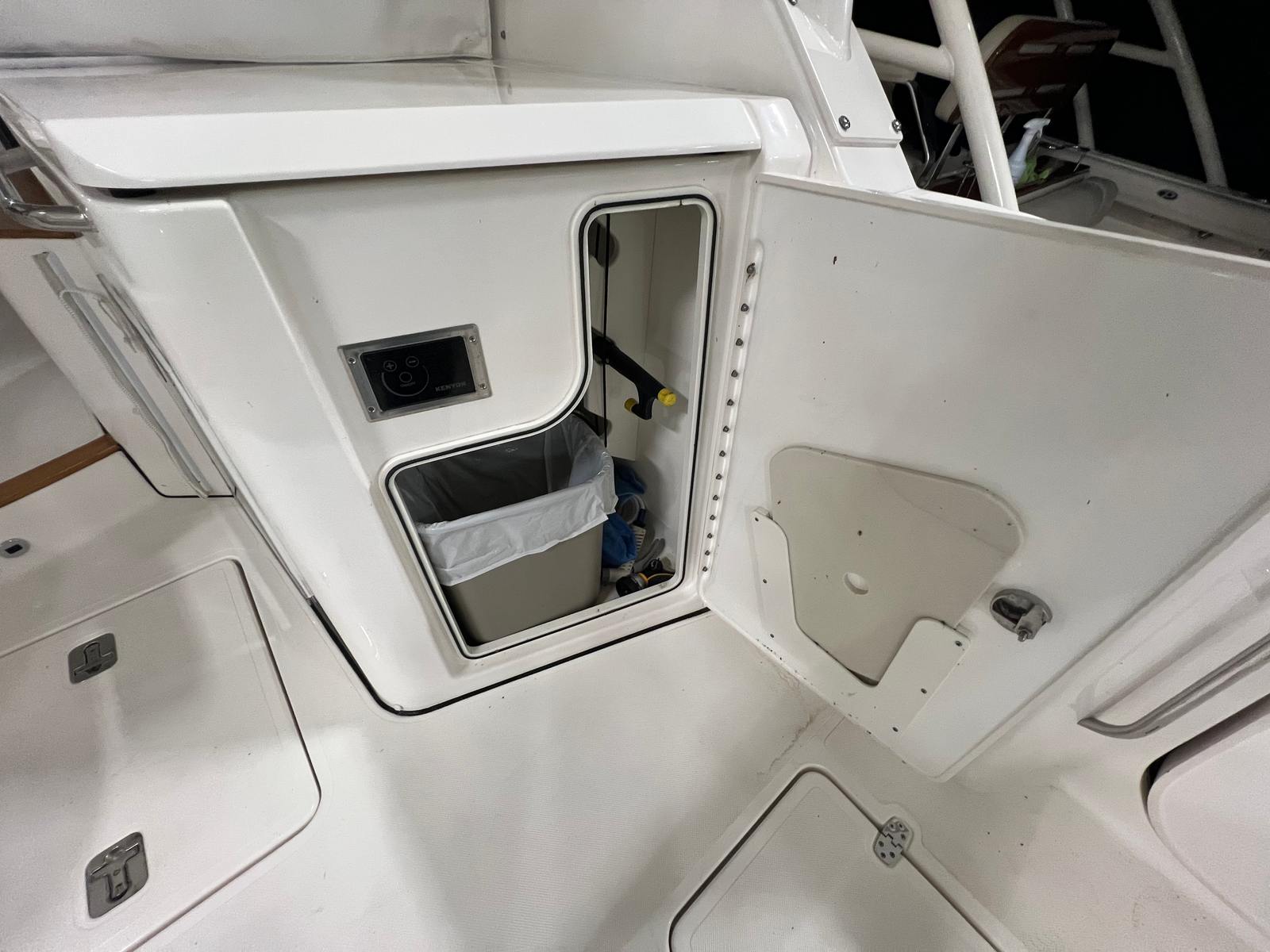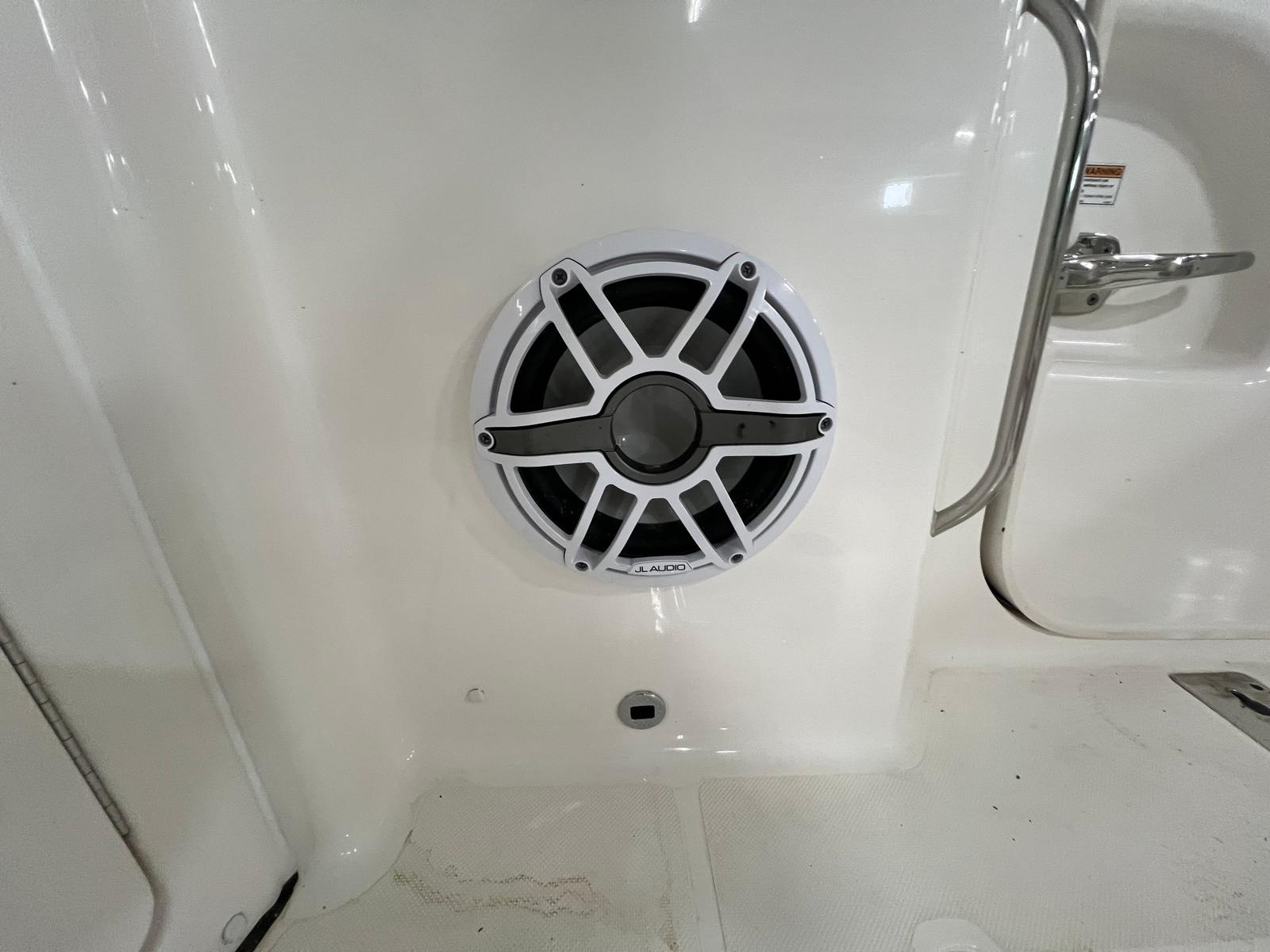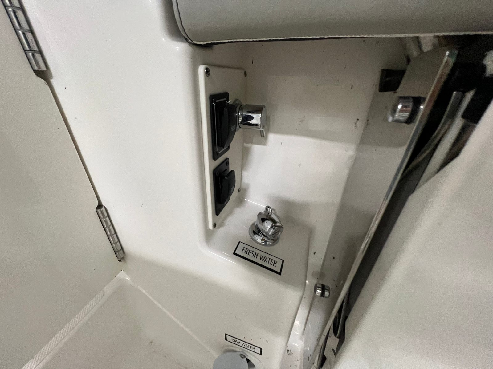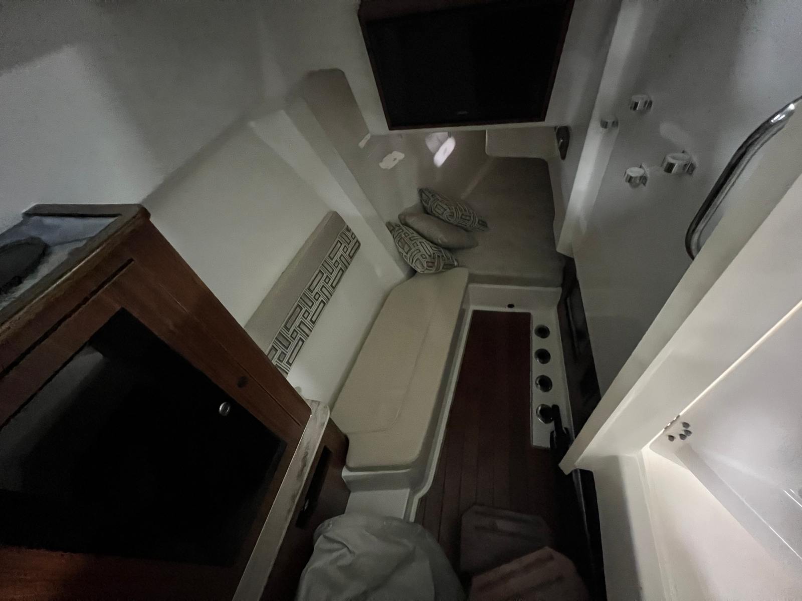 The versatile layout offers an open bow for enjoying sunny days on the water, a powered Mediterranean shade that provides instant relief from the sun, and the ability to fully enclose the helm area when the weather shifts. The boat also features comfortable seating throughout, premium helm electronics, ample storage, a well-appointed cabin, and a head for extended days on the water.