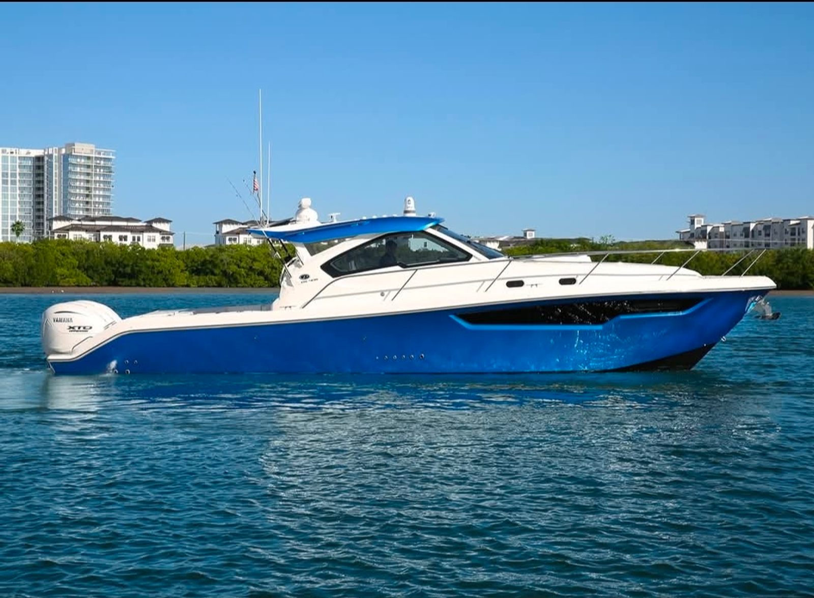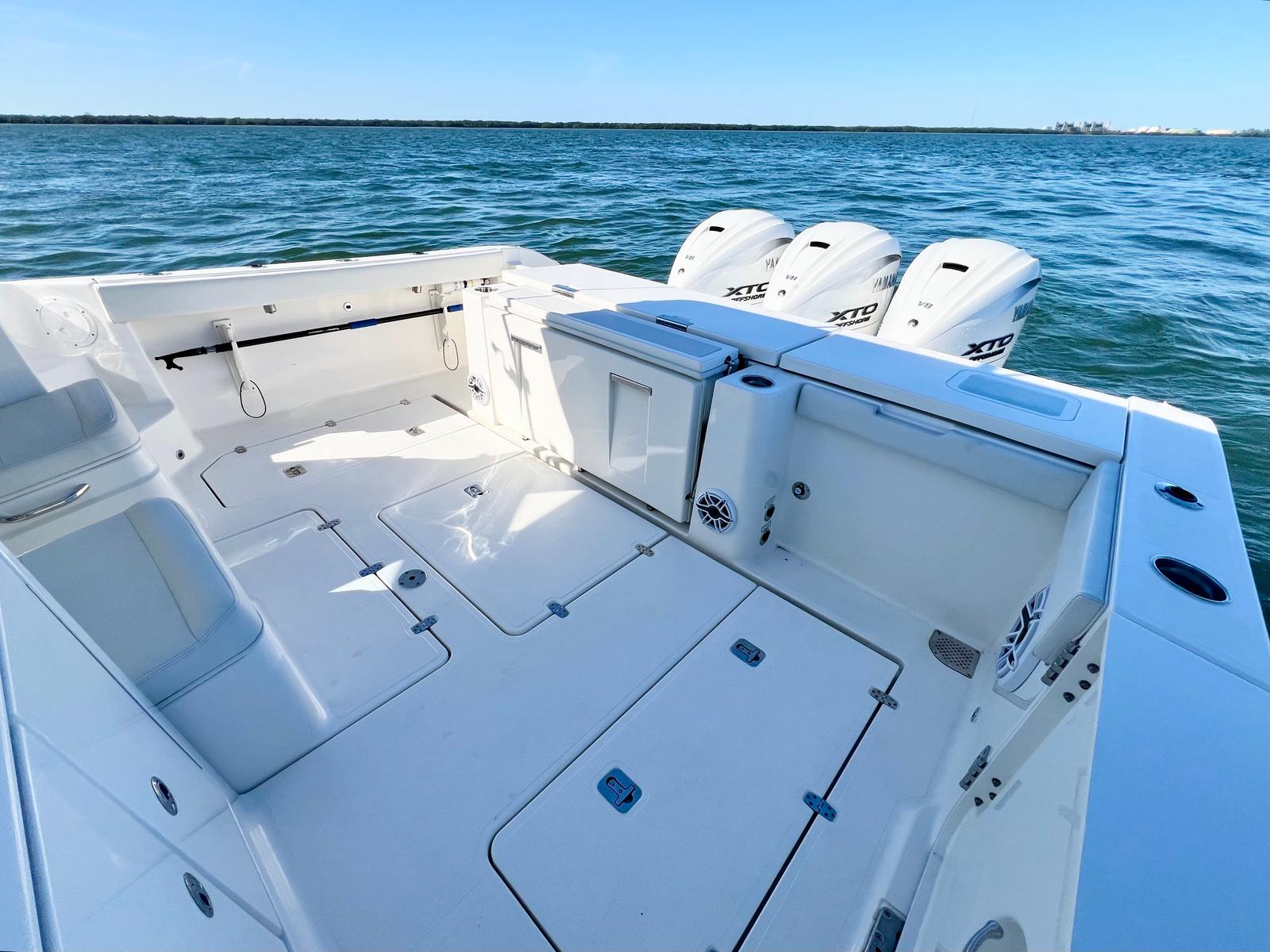 Triple Yamaha® Digital 450 XTO (Pearlescent White) with Integrated Electric Steering (DES), Helm Master® EX Digital Electronic Control (DEC) and Yamaha® Joystick Control with Full Maneuverability (Set Point™ and Autopilot), Multifunction Display Interface, Manual Engine Flushing System.