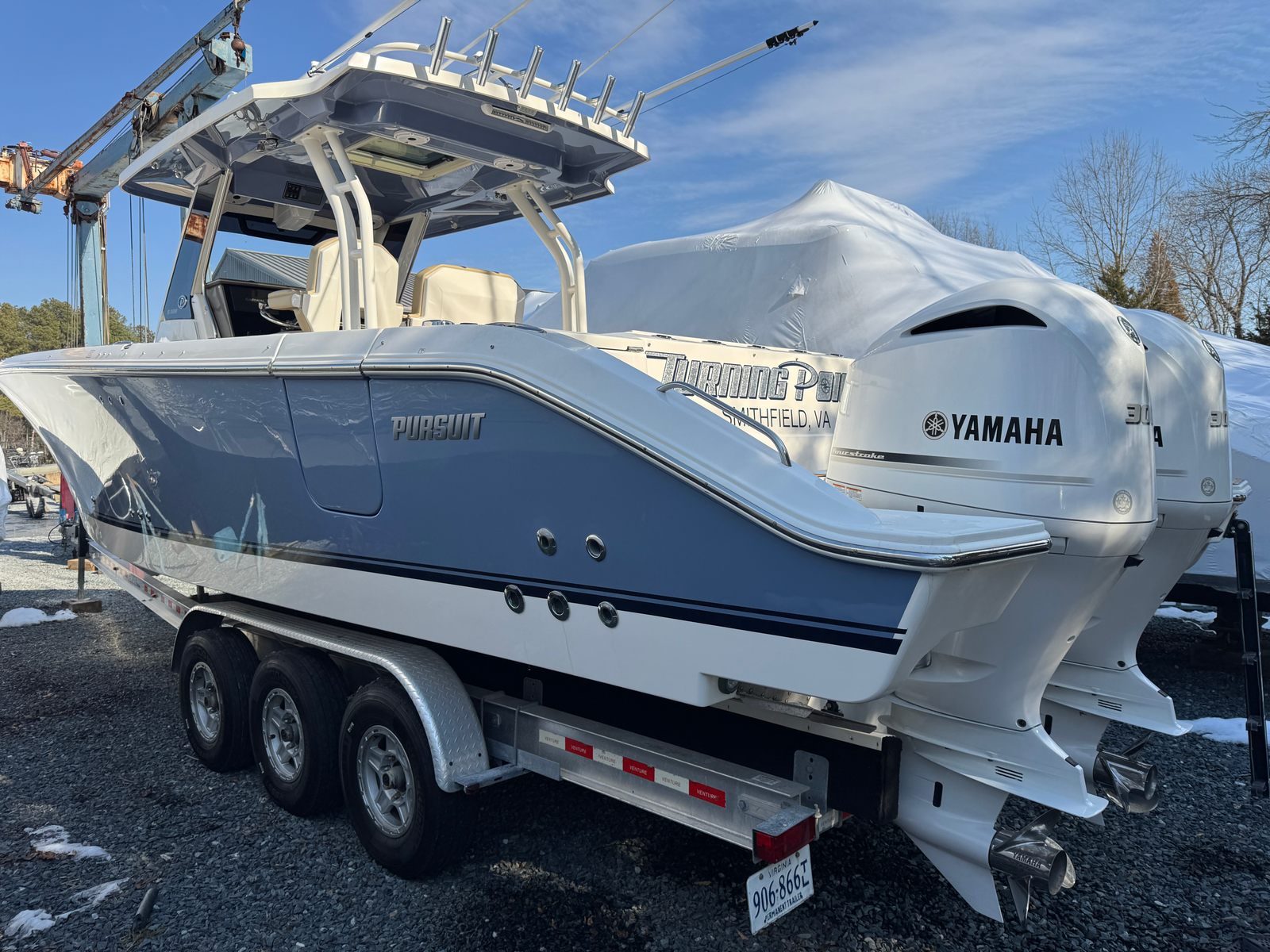 2020 Pursuit S328 Sport powered by twin 300 Yamaha engines with 386 hours. This boat has been meticulously maintained since purchased from us new by the original owner, lift kept under boathouse roof and stored in a climate controlled shop during the winters. It has been ceramic coated inside and out yearly and shows just as well as a 2026 sitting in our showroom. There is not a nicer, more well equipped, and well cared for Pursuit S328 on the used market that you will find! Trailer not included, but available for purchase.