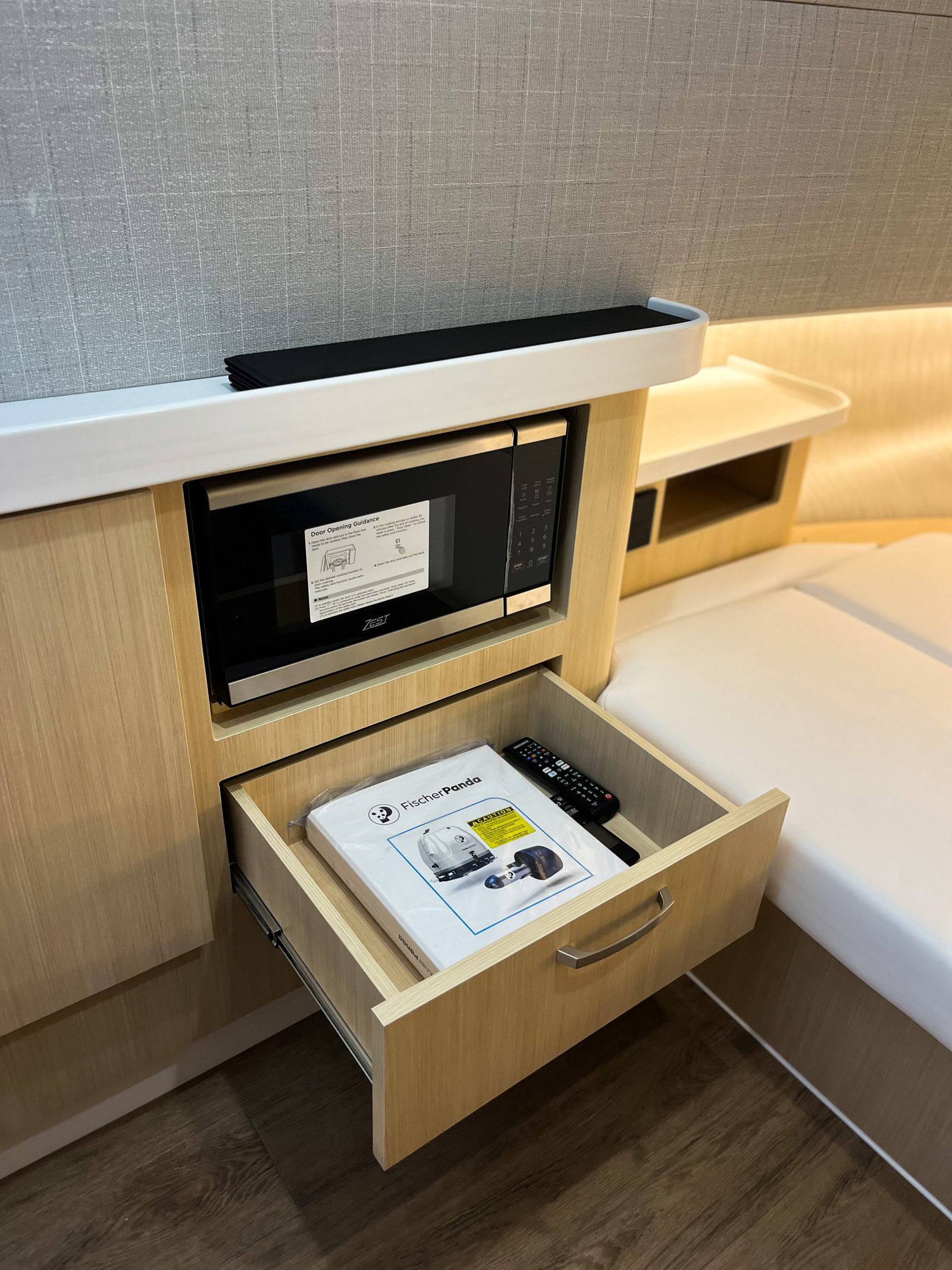 The Regal 38 SAV is as practical as it is luxurious. The anchor windlass with rope and chain simplifies the anchoring process, allowing you to secure your yacht quickly and confidently. Fender clips make docking straightforward, reducing stress and protecting your investment. The cockpit refrigerator is perfect for keeping snacks and beverages cool, ensuring you are always ready for a day of fun on the water.Storage solutions throughout the yacht provide plenty of space for gear, supplies, and personal items, keeping the deck clutter-free and organized. The efficient engine system not only delivers impressive power but also helps manage fuel consumption, making it easier to plan longer trips without frequent stops. The gray water system adds another layer of convenience, allowing you to enjoy extended stays on the water with minimal impact on the environment.