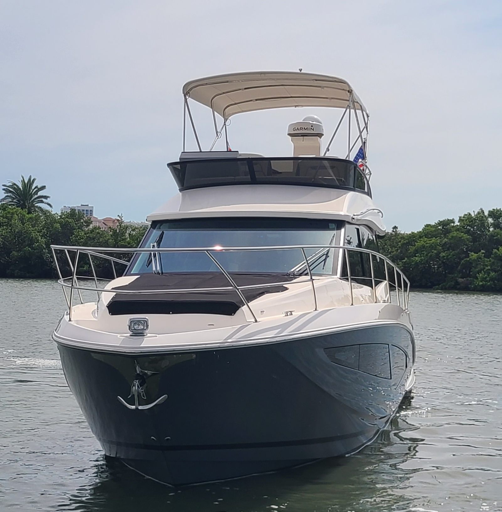 Twin Garmin 22 inch screens, VHF Radio, Radar, Auto Pilot, LED Trim Indicator, Fusion stereo system, Sat TV, Fridge freezer option, two burner stove, Washer Dryer combo, Two head stateroom configuration with one having the walk-in shower.