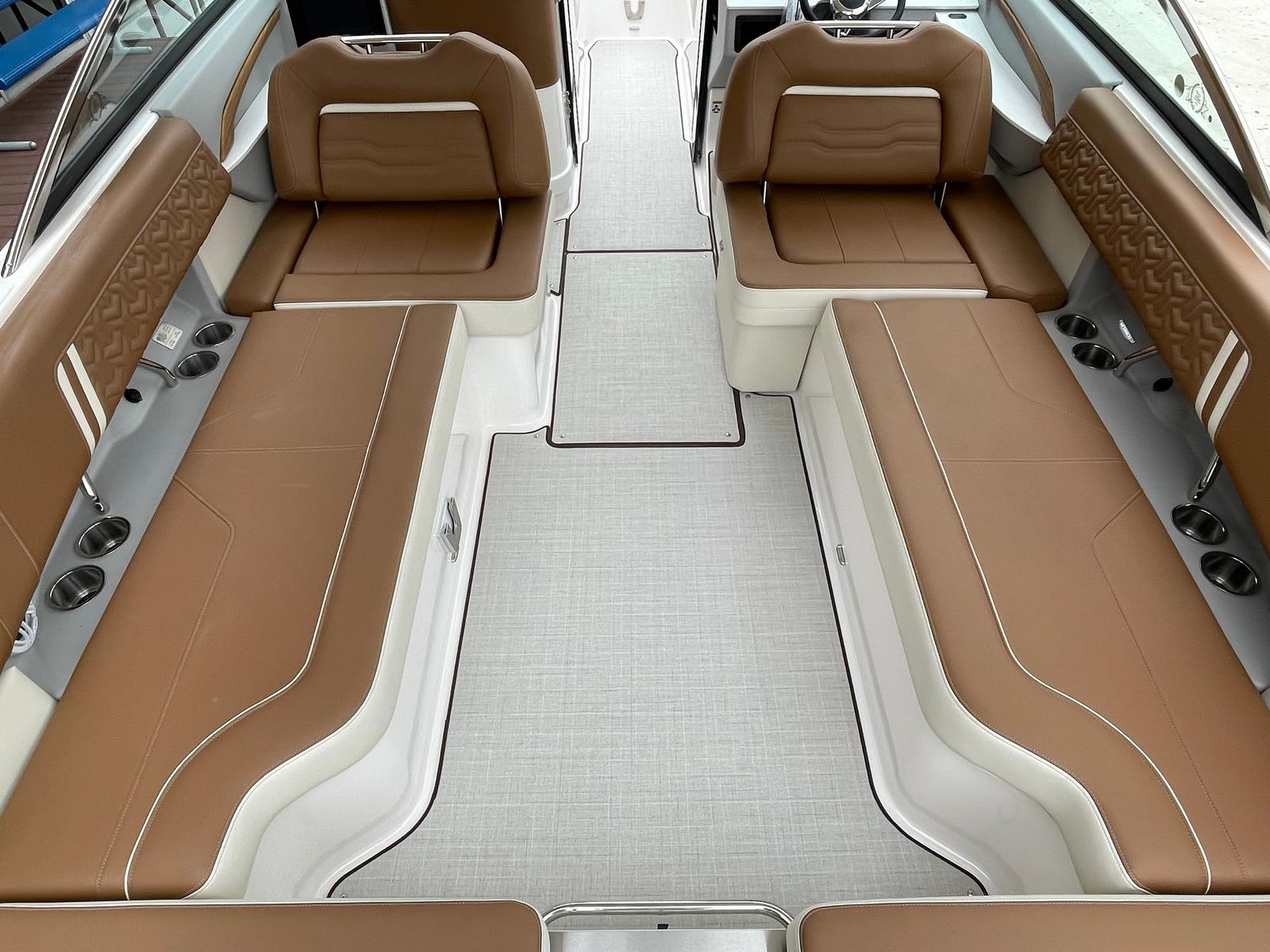 The Regal LS9 Bowrider is packed with premium features that enhance both its appearance and functionality. The Mediterranean Blue hull and bottom color create a sophisticated look, while the Flame Red bootstripe adds a bold touch of personality. Inside, the LS9 boasts a luxurious multi-zone seating arrangement, with Saddle Brown - Chil upholstery in Zones 1, 3, and 6, and Vista White - Standard in Zones 2, 4, and 5. This combination of colors and materials provides a refined, inviting atmosphere for you and your guests. The ergonomic seating is designed for maximum comfort, allowing everyone onboard to relax and enjoy the ride.