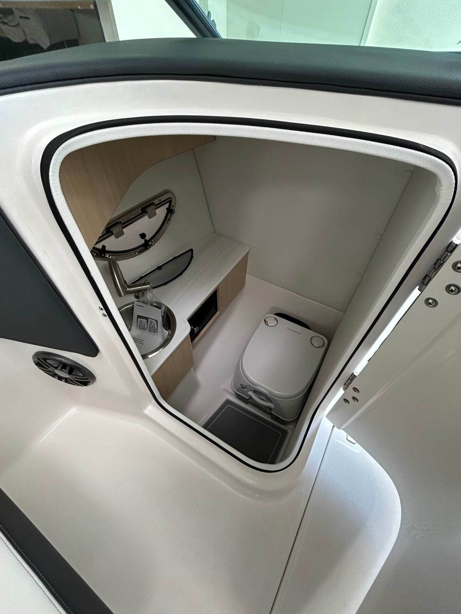 The 2025 Regal LX4 comes loaded with premium features that elevate your boating experience. The dual Garmin 943 displays provide state-of-the-art navigation and system monitoring, giving you confidence and control at the helm. The transom shower and pressure water package add a touch of convenience, allowing you to rinse off after a swim or clean up with ease. The hull’s Steel Grey color is complemented by a black travel storage cover, ensuring your boat stays protected when not in use.The PowerTower in white is a standout feature, offering both style and functionality, while the head compartment adds a level of comfort and privacy for longer outings. The inclusion of a premium package ensures that every detail, from upholstery to hardware, meets the highest standards of luxury. The port light in a half-moon design brings in natural light and enhances the cabin’s ambiance. With black canvas accents, the LX4’s aesthetic is both modern and timeless, making it a Regal boat for sale that truly stands out.