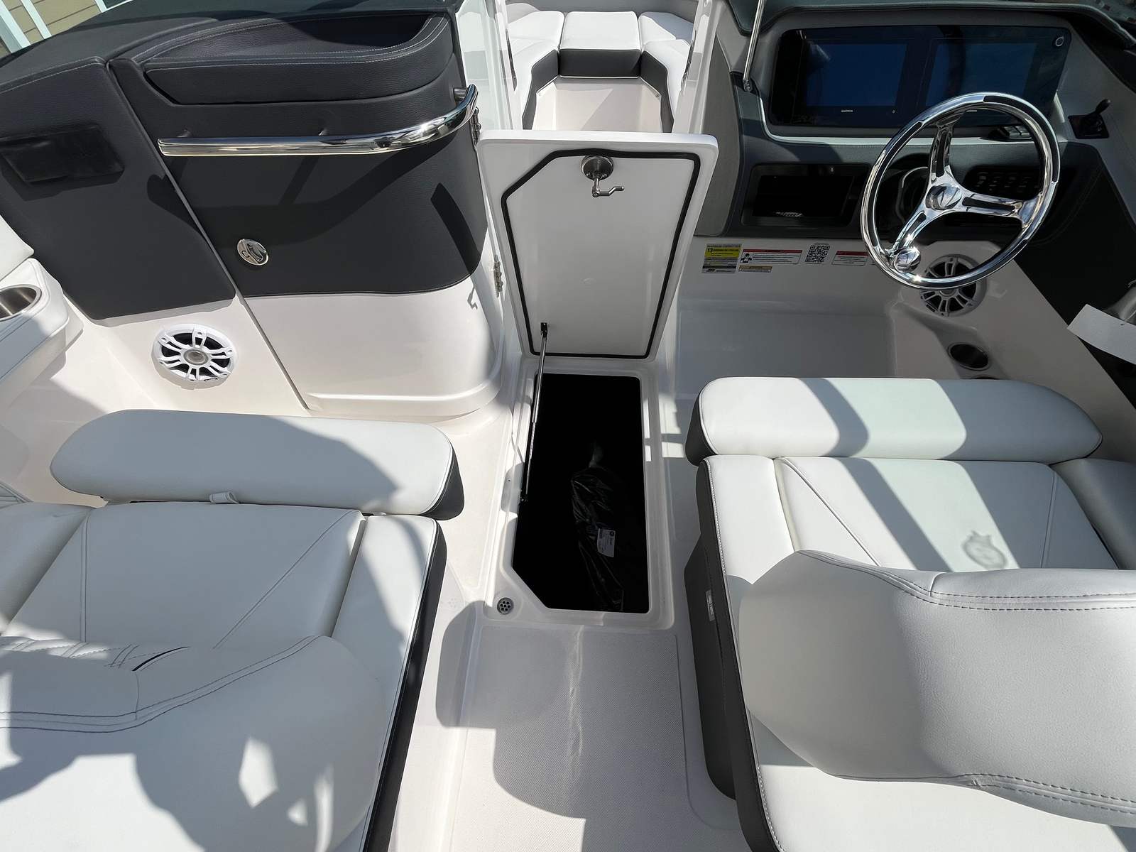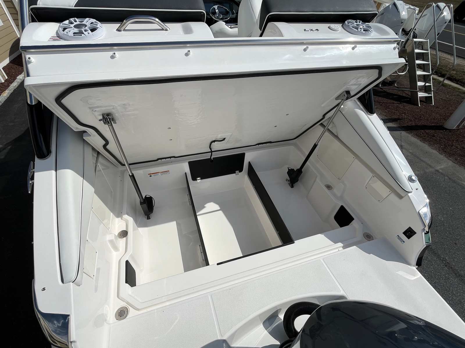 The 2025 Regal LX4 is loaded with special features designed to enhance your time on the water. The striking Tahiti Beach White and Black exterior, complemented by Titanium accents, gives this bowrider a modern and sophisticated look that is sure to turn heads wherever you go. Bow and cockpit covers in Black Canvas provide protection from the elements, keeping your boat looking pristine and ready for action.For added convenience and peace of mind, the LX4 is equipped with a dual battery switch with tray and cables, ensuring reliable power management for all your onboard systems. The battery charger keeps your batteries topped up and ready for extended adventures, while the bow thruster offers precise control when docking or maneuvering in tight quarters.The transom shower and pressure water package add a touch of luxury, allowing you and your guests to rinse off after a swim or simply freshen up during a day on the water. Every feature is thoughtfully integrated to enhance comfort, convenience, and enjoyment, making the LX4 a standout choice among bowrider boats for sale.