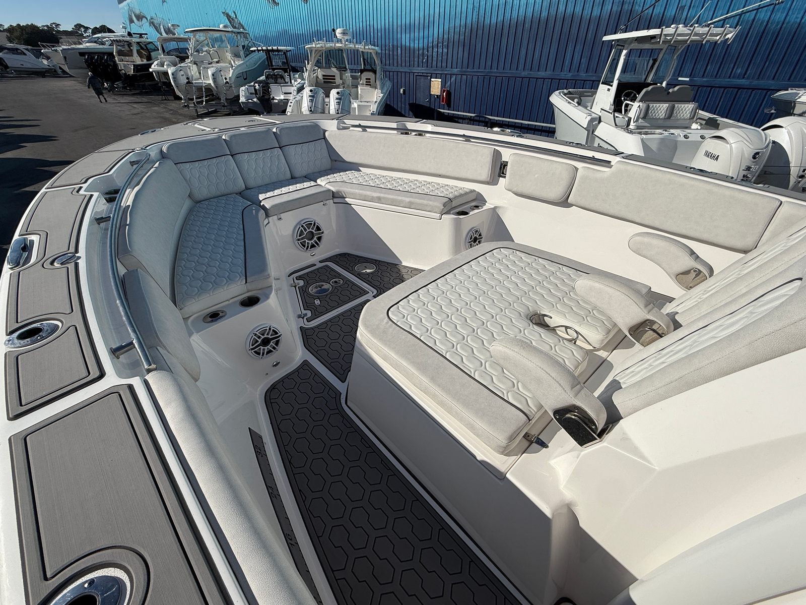 Under the hood, the Sea Fox 328 Commander is powered by twin engines, delivering a combined 850 horsepower. This impressive power setup ensures that you have the speed and agility needed for a variety of activities, from high-speed runs to leisurely cruises. The dual-engine configuration not only enhances performance but also provides added reliability and peace of mind when venturing farther from shore. Whether you are chasing the horizon or navigating tight marinas, the responsive handling and robust acceleration of this center console boat make every outing a memorable experience.