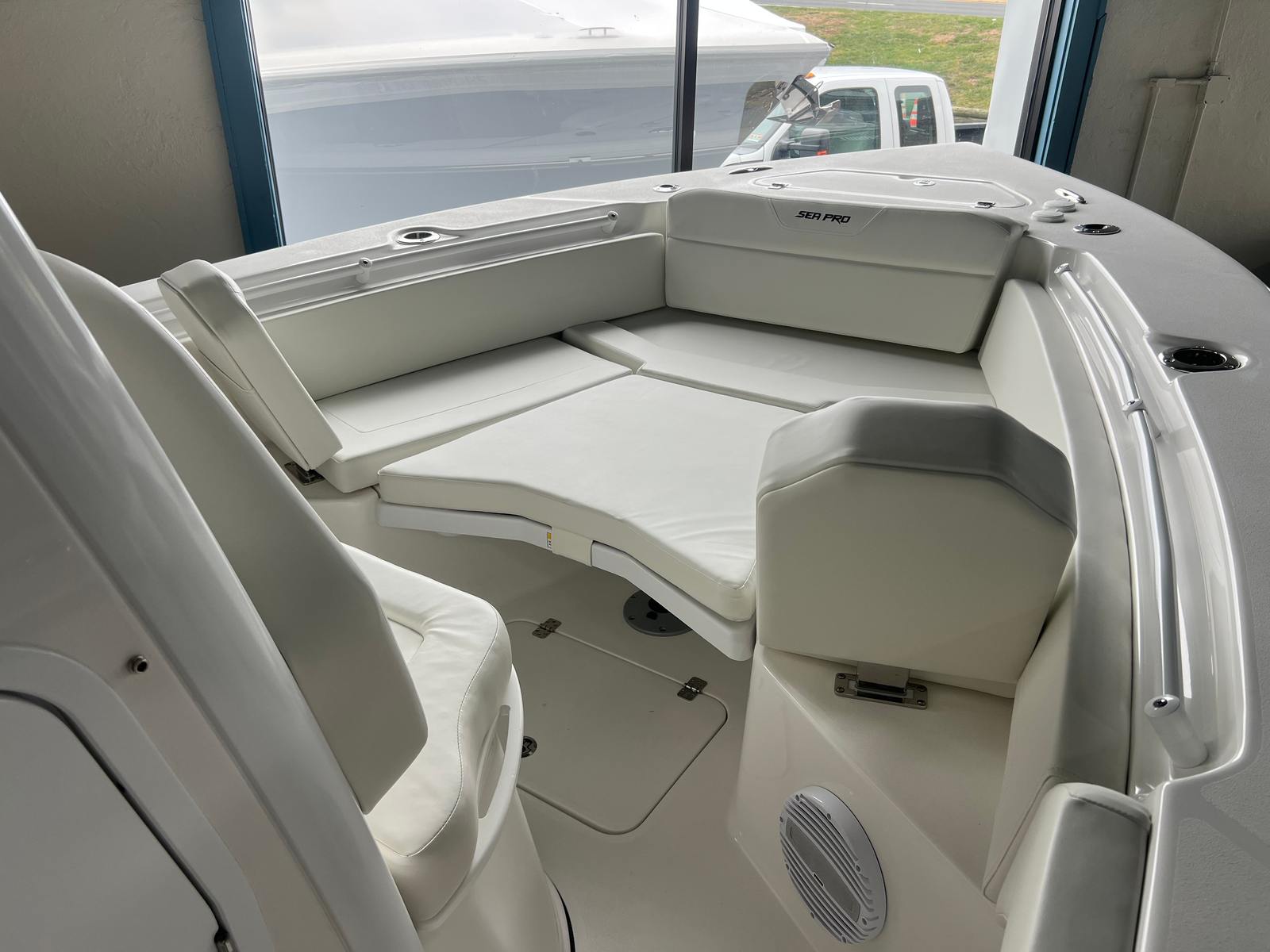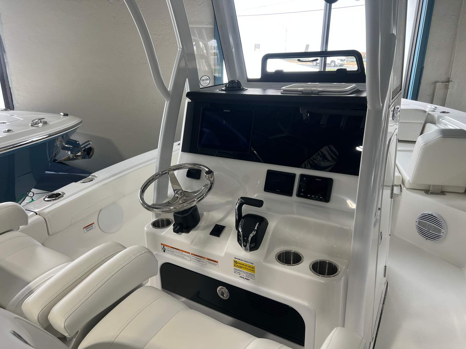The Sea Pro 245 Flxr Center Console is packed with features that enhance both comfort and functionality. The Complete Bolster Package upholstery provides plush seating and support, ensuring a comfortable experience for you and your guests during long days on the water. The Lewmar Thru-Hull Windlass Pro-Fish 1000 anchoring system offers effortless anchoring, allowing you to secure your position with confidence and ease.For sun protection and added versatility, the Sun Shade Bow (including two rod holders) creates a shaded area at the front of the boat, perfect for relaxing or casting a line. The upgraded audio system, featuring an amplifier, subwoofer, and six speakers, transforms your outings into lively social gatherings with crystal-clear sound. Communication is seamless with the VHF Radio RS20, keeping you connected for safety and convenience.The hard top is equipped with a light bar, enhancing visibility during early morning departures or evening cruises. Additionally, the wireless phone charger and holder at the helm ensure your devices stay powered and accessible throughout your journey. The COAST GUARD KIT NO ANCHORING adds an extra layer of safety, providing peace of mind for every trip.