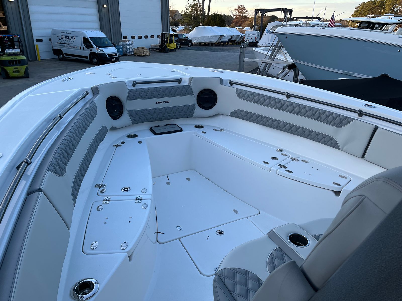The Sea Pro 322 DLX is packed with features that enhance both functionality and comfort. The Shark Skin (Gray) hull and bottom color not only contribute to the boat’s striking appearance but also offer added protection and durability. The console helm pod and FGLP are finished in standard white, creating a clean and modern aesthetic that complements the overall design. The Platinum upholstery provides plush seating for you and your guests, ensuring comfort during long days on the water. The Hammer Gray powder coat adds a layer of resilience to the boat’s hardware, protecting against the elements and maintaining the vessel’s pristine look.For those who love socializing and entertaining, the stern sandbar table attachment is a standout feature, transforming the rear of the boat into the perfect gathering spot for snacks, drinks, and conversation. The side entry door ladder offers easy access for swimming, diving, or boarding from the dock, enhancing the boat’s versatility and convenience. With these thoughtful additions, the Sea Pro 322 DLX is designed to cater to a wide range of boating activities and lifestyles.