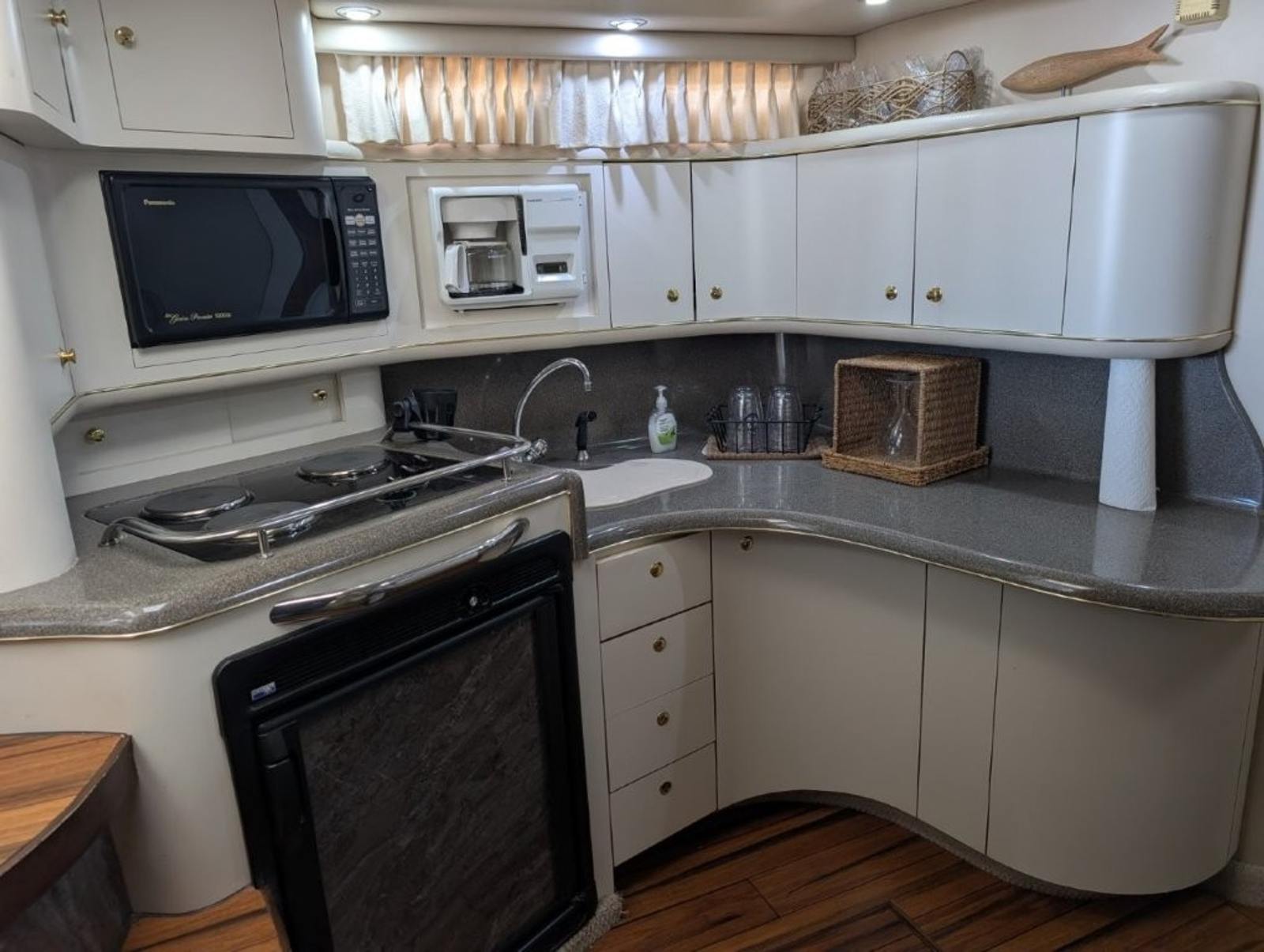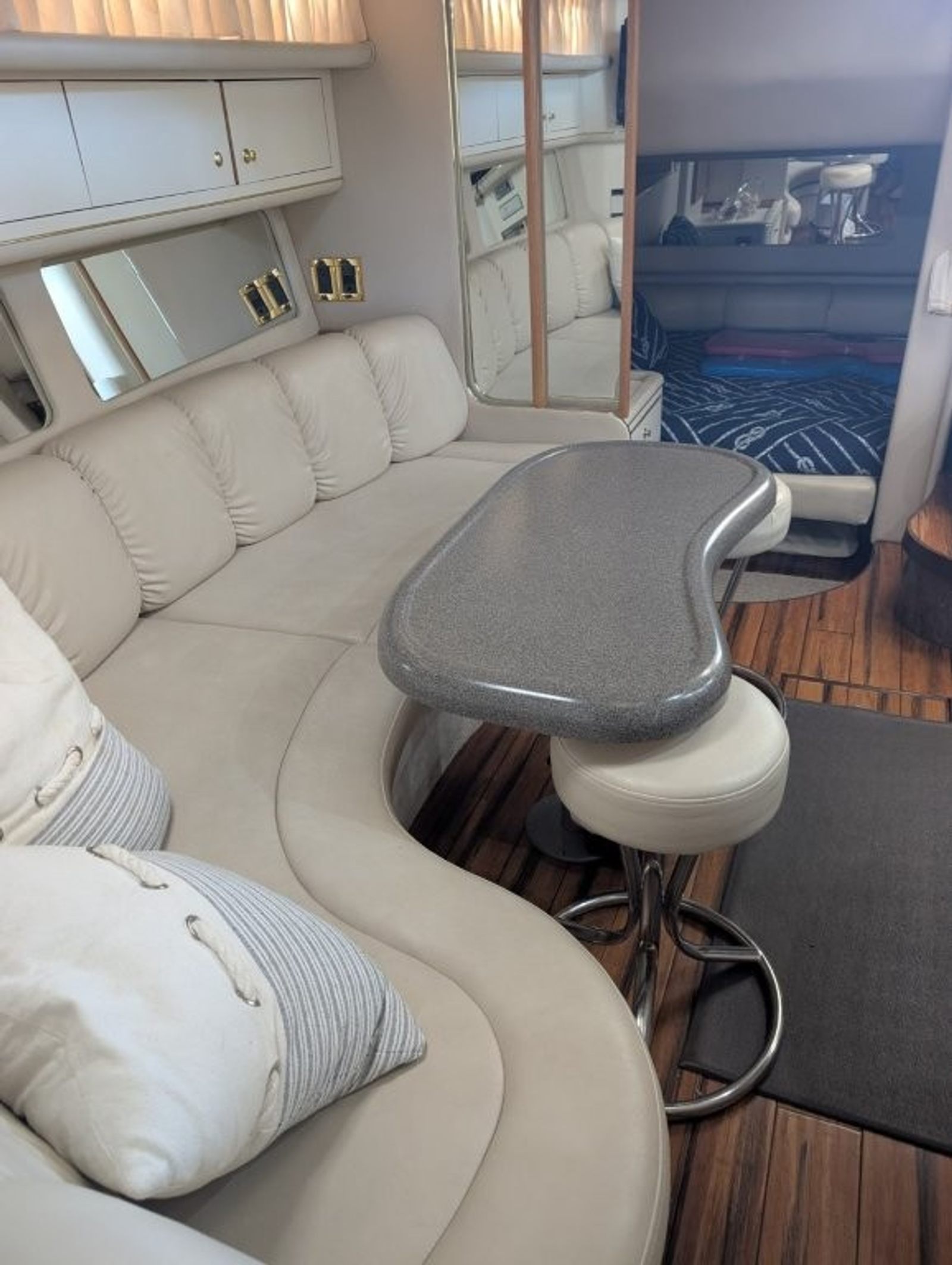 Inside the cabin, the upgraded hardwood bamboo flooring gives the interior a clean, updated look while remaining durable and easy to maintain. The Sundancer layout provides a roomy salon, full galley, forward berth, and private mid-cabin sleeping area, making it easy to host family or guests overnight. Large windows and an open design help keep the cabin bright and comfortable.
