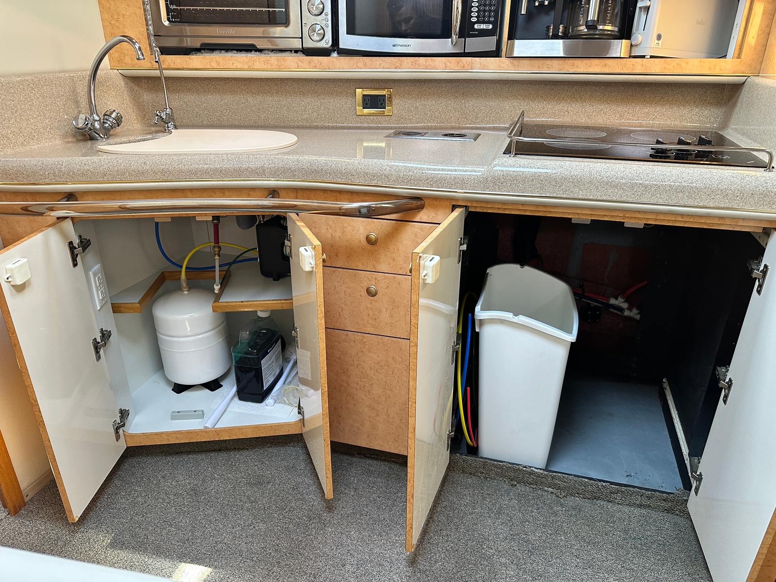 Under the hood, the Sundancer 450 is powered by twin engines, delivering a combined 840 horsepower. With only 428 engine hours, these motors promise robust performance and longevity, ensuring many more seasons of smooth cruising ahead. The dual-engine setup provides enhanced maneuverability and stability, making docking and navigating tight spaces a breeze. Whether you’re cruising along the coastline or heading out for a weekend adventure, the Sundancer 450’s powerful engines offer the speed and reliability you need for a truly exhilarating experience on the water.